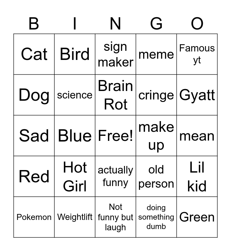 This bingo card has a free space and 24 words: Hot Girl, Weightlift, Brain Rot, Pokemon, Famous yt, Cat, Dog, Bird, make up, actually funny, cringe, Sad, old person, Lil kid, science, doing something dumb, mean, sign maker, Gyatt, Blue, Green, Red, meme and Not funny but laugh.