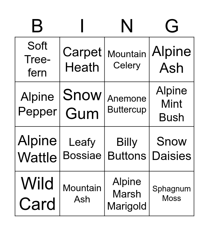 This bingo card has 16 words: Mountain Ash, Snow Daisies, Mountain Celery, Soft Tree-fern, Alpine Wattle, Carpet Heath, Billy Buttons, Alpine Marsh Marigold, Alpine Pepper, Snow Gum, Wild Card, Alpine Ash, Leafy Bossiae, Alpine Mint Bush, Anemone Buttercup and Sphagnum Moss.