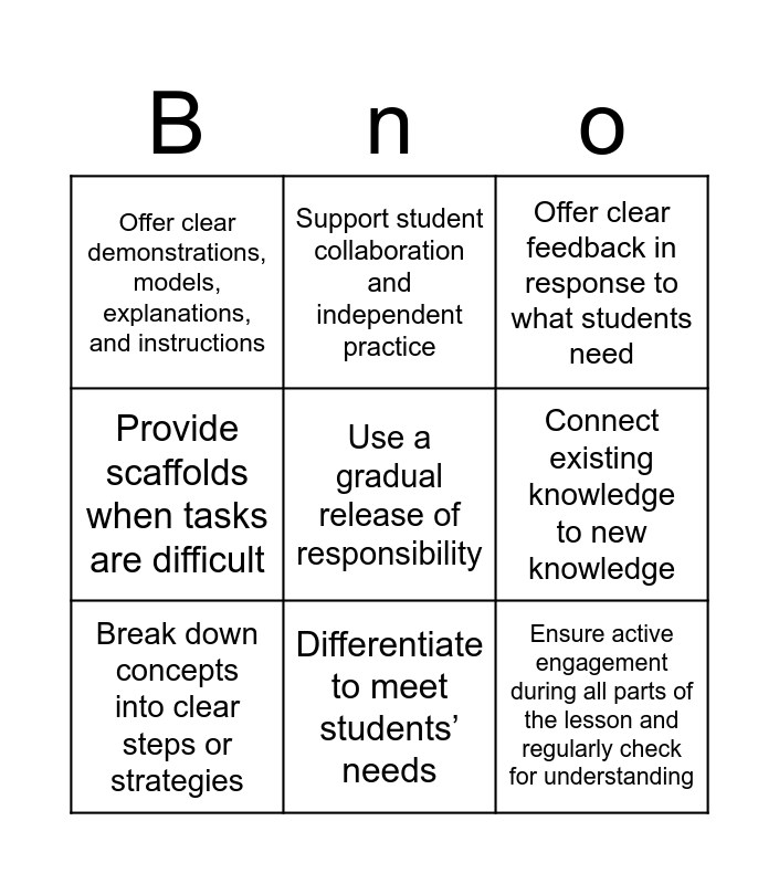 This bingo card has a free space and 8 words: Connect existing knowledge to new knowledge, Offer clear feedback in response to what students need, Support student collaboration and independent practice, Break down concepts into clear steps or strategies, Offer clear demonstrations, models, explanations, and instructions, Ensure active engagement during all parts of the lesson and regularly check for understanding, Provide scaffolds when tasks are difficult and Differentiate to meet students’ needs.