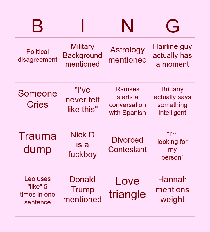 This bingo card has 16 words: Donald Trump mentioned, "I'm looking for my person", Astrology mentioned, Political disagreement, Trauma dump, Military Background mentioned, Divorced Contestant, Love triangle, Someone Cries, "I've never felt like this", Leo uses "like" 5 times in one sentence, Hairline guy actually has a moment, Nick D is a fuckboy, Brittany actually says something intelligent, Ramses starts a conversation with Spanish and Hannah mentions weight.