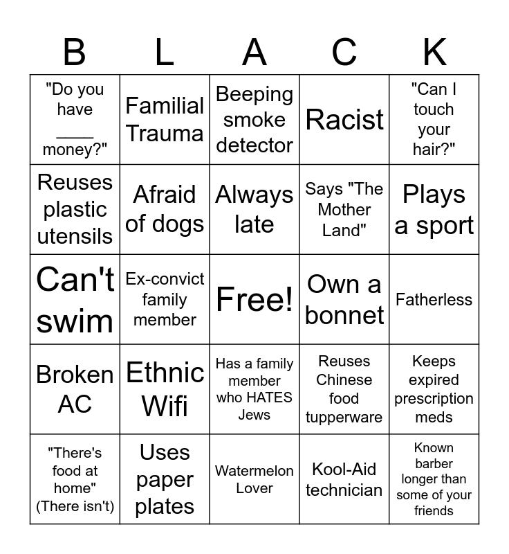 This bingo card has a free space and 24 words: "There's food at home" (There isn't), Ethnic Wifi, Always late, Kool-Aid technician, "Can I touch your hair?", "Do you have ____ money?", Familial Trauma, Beeping smoke detector, Own a bonnet, Fatherless, Can't swim, Afraid of dogs, Reuses Chinese food tupperware, Keeps expired prescription meds, Reuses plastic utensils, Uses paper plates, Watermelon Lover, Racist, Plays a sport, Broken AC, Ex-convict family member, Has a family member who HATES Jews, Says "The Mother Land" and Known barber longer than some of your friends.