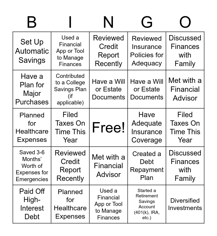 This bingo card has a free space and 75 words: Created a Budget and Track Expenses, Established an Emergency Fund, Reviewed Credit Report Recently, Have a Retirement Savings Plan, Started Estate Planning, Paid Off High-Interest Debt, Set Up Automatic Savings, Have Adequate Insurance Coverage, Started an Investment Portfolio, Have a Financial Education Goal, Created a Debt Repayment Plan, Met with a Financial Advisor, Have a Will or Estate Documents, Have a Plan for Major Purchases, Regularly Review Financial Goals, Filed Taxes On Time This Year, Started a Retirement Savings Account (401(k), IRA, etc.), Diversified Investments, Adjusted Budget After a Major Life Change, Discussed Finances with Family, Saved 3-6 Months’ Worth of Expenses for Emergencies, Planned for Healthcare Expenses, Contributed to a College Savings Plan (if applicable), Used a Financial App or Tool to Manage Finances, Reviewed Insurance Policies for Adequacy, Adjusted Budget After a Major Life Change, Discussed Finances with Family, Saved 3-6 Months’ Worth of Expenses for Emergencies, Planned for Healthcare Expenses, Contributed to a College Savings Plan (if applicable), Used a Financial App or Tool to Manage Finances, Reviewed Insurance Policies for Adequacy, Have a Financial Education Goal, Created a Debt Repayment Plan, Met with a Financial Advisor, Have a Will or Estate Documents, Have a Plan for Major Purchases, Regularly Review Financial Goals, Filed Taxes On Time This Year, Started a Retirement Savings Account (401(k), IRA, etc.), Diversified Investments, Created a Budget and Track Expenses, Established an Emergency Fund, Reviewed Credit Report Recently, Have a Retirement Savings Plan, Started Estate Planning, Paid Off High-Interest Debt, Set Up Automatic Savings, Have Adequate Insurance Coverage, Started an Investment Portfolio, Created a Debt Repayment Plan, Met with a Financial Advisor, Have a Will or Estate Documents, Have a Plan for Major Purchases, Regularly Review Financial Goals, Filed Taxes On Time This Year, Started a Retirement Savings Account (401(k), IRA, etc.), Diversified Investments, Created a Budget and Track Expenses, Established an Emergency Fund, Reviewed Credit Report Recently, Have a Retirement Savings Plan, Started Estate Planning, Paid Off High-Interest Debt, Set Up Automatic Savings, Have Adequate Insurance Coverage, Started an Investment Portfolio, Have a Financial Education Goal, Adjusted Budget After a Major Life Change, Discussed Finances with Family, Saved 3-6 Months’ Worth of Expenses for Emergencies, Planned for Healthcare Expenses, Contributed to a College Savings Plan (if applicable), Used a Financial App or Tool to Manage Finances and Reviewed Insurance Policies for Adequacy.