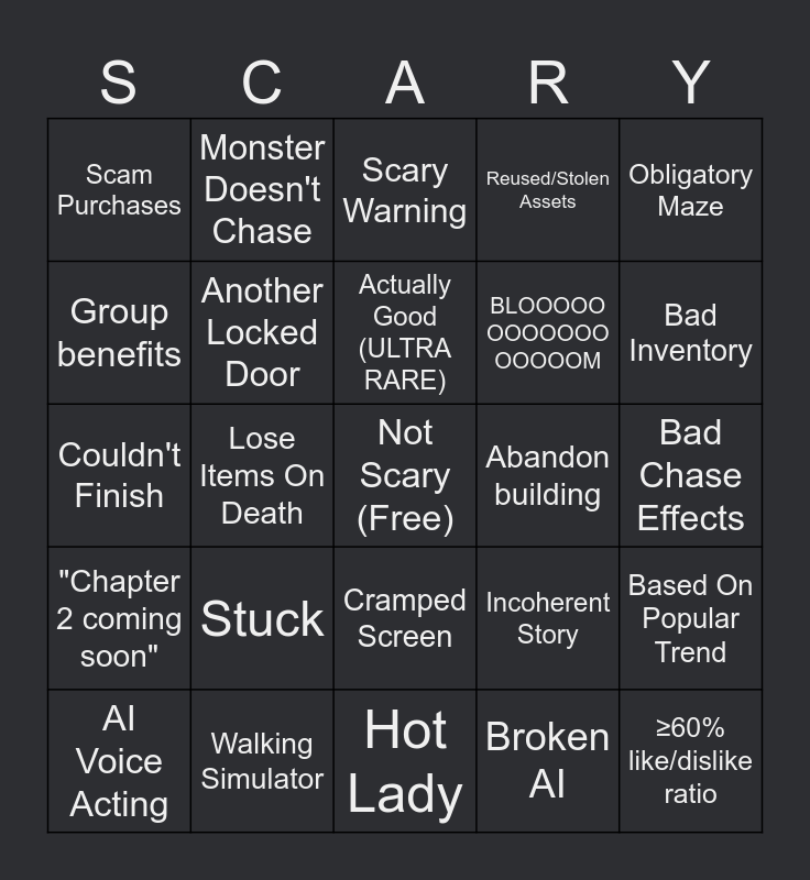 This bingo card has a free space and 60 words: Paid Revive, Walking Simulator, Collectathon, "Chapter 2 coming soon", Broken AI, Game Copy, Another Locked Door, It Was Just a Dream, BLOOOOO OOOOOOO OOOOOM, Lockers, Reused/Stolen Assets, Flashlight Sucks, Group benefits, Walk-in teleporters, Cheap Jump Scares, Scam Purchases, ≥60% like/dislike ratio, Obligatory Maze, Mental Hospital, Actually Good (ULTRA RARE), Abandon building, Scary Warning, AI Voice Acting, Based On Popular Trend, Relative, Obligatory Chase Sequence, Generic Green Sprint Bar, Infinite Sprint, Bad Inventory, Poor Quality Filter, Broken Game, Can't Outrun Monster, Bad Lighting, Poor Map Boundaries, Monster Doesn't Chase, Can't See, Mascot Horror, Lose Items On Death, Paid Skins, Couldn't Finish, Tall Skinny Monster, Stuck, Bad Chase Effects, Generators, Incoherent Story, Poor English, "Puzzles", Donation Board, Bad Teleport, Cramped Screen, Hot Lady, No Spectating, Spawn Camping, Multiple Endings, Claustrophobic Crawlspace/ Hallway, Cultural Horror, Bad/Confusing Cutscenes, Excessively Loud Jumpscares, Overly Long Tasks and No Jumping.