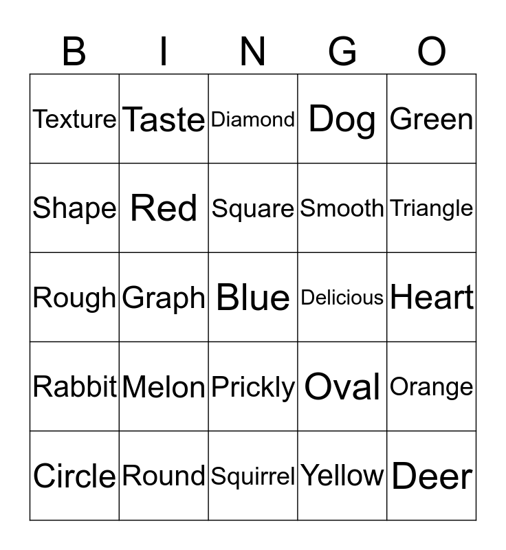 This bingo card has a free space and 24 words: Melon, Round, Square, Circle, Green, Texture, Shape, Taste, Delicious, Prickly, Smooth, Rough, Oval, Orange, Red, Yellow, Heart, Diamond, Triangle, Graph, Deer, Rabbit, Dog and Squirrel.