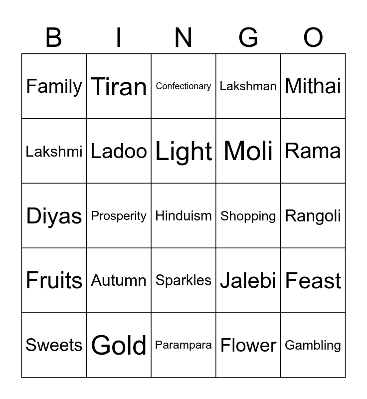This bingo card has 42 words: Gifts, Light, Pooja, Autumn, Flower, Feast, Hinduism, Firecracker, Confectionary, Sparkles, Rangoli, Rama, Prosperity, Mithai, India, Jalebi, Deepavali, Diyas, Lanterns, Tiran, Lakshmi, Five days, Gambling, Family, Good Fortune, Ganesh, Moli, Rolli, Rice, Haldi, Matchbox, Fruits, Ladoo, Parampara, Dhoop, Sweets, Gold, Shopping, Friends, Sita, Lakshman and Ravana.
