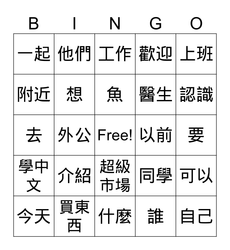 This bingo card has a free space and 24 words: 介紹, 買東西, 魚, 今天, 上班, 一起, 附近, 他們, 以前, 超級市場, 醫生, 去, 同學, 可以, 想, 誰, 要, 工作, 認識, 外公, 自己, 學中文, 歡迎 and 什麼.