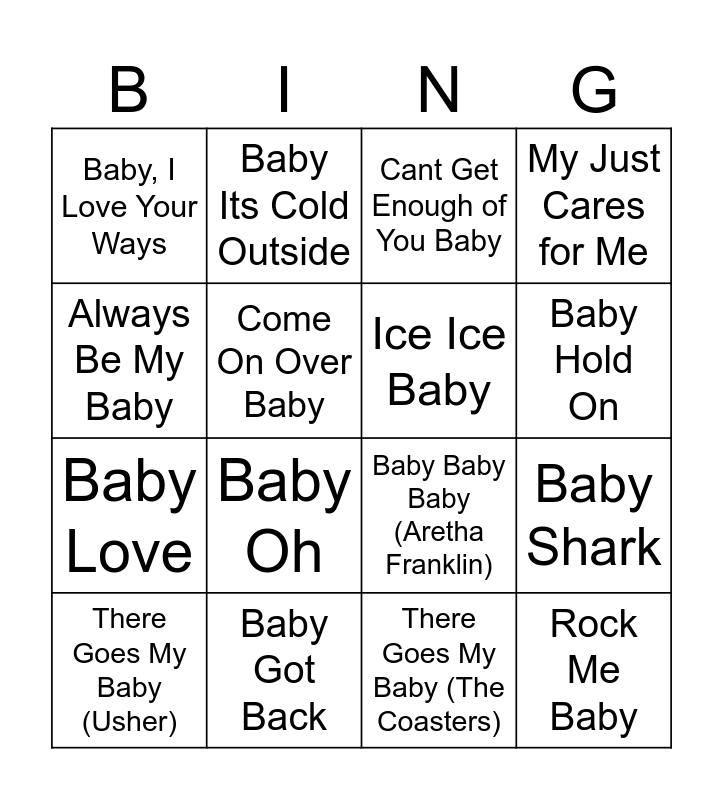 This bingo card has 25 words: Free!, Hey Baby, Baby Hold On, I Got You Babe, Always Be My Baby, Baby, I Love Your Ways, Come On Over Baby, Baby Its Cold Outside, Baby Got Back, Baby Boy, Baby Love, Baby Baby Baby (Aretha Franklin), Hey Baby Que Paso, Give It To Me Baby, Ice Ice Baby, Baby One More Time, There Goes My Baby (The Coasters), Cant Get Enough of You Baby, Baby Oh, Baby Shark, There Goes My Baby (Usher), Cry Baby, Rock Me Baby, My Just Cares for Me and Santa Baby.