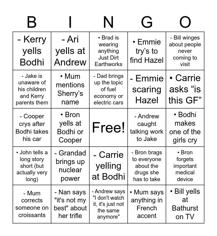 This bingo card has a free space and 24 words: - Grandad brings up nuclear power, - Nan says "it's not my best" about her trifle, - Dad brings up the topic of fuel economy or electric cars, - Mum corrects someone on croissants, - Bill winges about people never coming to visit, - Kerry yells Bodhi, - Jake is unaware of his children and Kerry parents them, - Ari yells at Andrew, - Andrew caught talking work to Jake, - Carrie yelling at Bodhi, - Emmie scaring Hazel, - Cooper crys after Bodhi takes his car, - Bron brags to everyone about the drugs she has to take, • Bron forgets important medical device, • Mum mentions Sherry’s name, • Mum says anything in French accent, • Bodhi makes one of the girls cry, • Brad is wearing anything Just Dirt Earthworks, • Carrie asks “is this GF”, • Bron yells at Bodhi or Cooper, • Bill yells at Bathurst on TV, • John tells a long story short (but actually very long), • Emmie try’s to find Hazel and - Andrew says "I don't watch it, it's just not the same anymore".