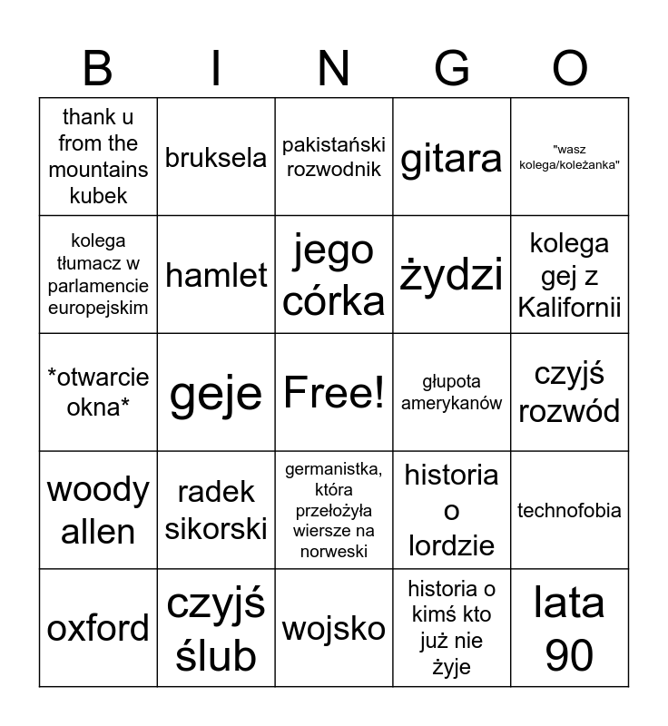 This bingo card has a free space and 29 words: oxford, coś rasistowskiego/ seksistowskiego, geje, *zmiana okularów*, thank u from the mountains kubek, pakistański rozwodnik, hamlet, radek sikorski, głupota amerykanów, czyjś ślub, czyjś rozwód, lata 90, wojsko, historia o kimś kto już nie żyje, kolega gej z Kalifornii, Nestle/frytki, germanistka, która przełożyła wiersze na norweski, woody allen, "wasz kolega/koleżanka", *otwarcie okna*, historia o lordzie, brudasy i zboczeńcy, żydzi, kolega tłumacz w parlamencie europejskim, gitara, bruksela, technofobia, jego córka and rozpad Jugosławii.