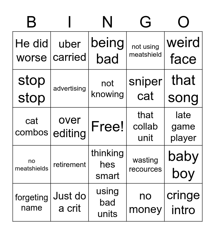 This bingo card has a free space and 24 words: retirement, Just do a crit, not knowing, forgeting name, weird face, He did worse, stop stop, uber carried, that collab unit, thinking hes smart, sniper cat, cat combos, wasting recources, baby boy, advertising, no money, late game player, being bad, that song, over editing, cringe intro, no meatshields, not using meatshield and using bad units.