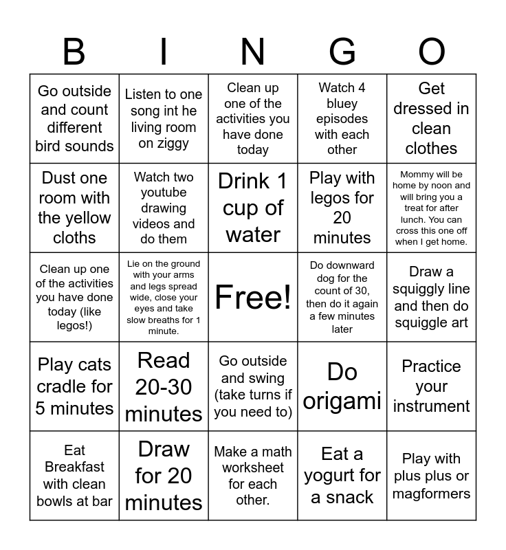 This bingo card has a free space and 24 words: Read 20-30 minutes, Draw for 20 minutes, Drink 1 cup of water, Eat Breakfast with clean bowls at bar, Get dressed in clean clothes, Go outside and count different bird sounds, Dust one room with the yellow cloths, Listen to one song int he living room on ziggy, Do downward dog for the count of 30, then do it again a few minutes later, Go outside and swing (take turns if you need to), Play with legos for 20 minutes, Clean up one of the activities you have done today (like legos!), Do origami, Practice your instrument, Watch two youtube drawing videos and do them, Eat a yogurt for a snack, Draw a squiggly line and then do squiggle art, Clean up one of the activities you have done today, Mommy will be home by noon and will bring you a treat for after lunch. You can cross this one off when I get home., Lie on the ground with your arms and legs spread wide, close your eyes and take slow breaths for 1 minute., Play with plus plus or magformers, Play cats cradle for 5 minutes, Watch 4 bluey episodes with each other and Make a math worksheet for each other..
