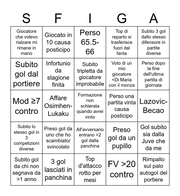 This bingo card has 25 words: Preso gol da uno che ho scambiato/ svincolato, Top d'attacco rotto per mesi, Subito tripletta da giocatore improbabile, Subito gol da chi non segnava da >1 anno, Subito 3 gol dallo stesso difensore in partite diverse, Giocatore che volevo rialzare mi rimane in mano, Subito gol dal portiere, Giocato in 10 causa posticipo, Perso una partita vinta causa posticipo, All'avversario entrano >2 gol dalla panchina, Voto di un mio giocatore <Di Maria con il monza, Mod ≥7 contro, Preso gol da un pupillo, Gol subito sia dalla Juve che da me, Infortunio da stagione finita, Rimpallo sul palo autogol del portiere, Lazovic-Becao, Perso 65.5-66, Perso dopo la fine dell'ultima partita di giornata, Affare Osimhen-Lukaku, Formazione non schierata quando avrei vinto, 3 gol lasciati in panchina, Subito lo stesso gol in 3 competizioni diverse, Top di reparto si trasferisce fuori dal fanta and FV >20 contro.