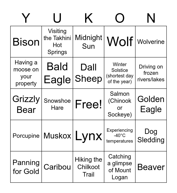 This bingo card has a free space and 41 words: Moose, Grizzly Bear, Arctic Fox, Bald Eagle, Caribou, Lynx, Dall Sheep, Raven (Yukon’s official bird), Wolverine, Porcupine, Snowshoe Hare, Wolf, Beaver, Golden Eagle, Salmon (Chinook or Sockeye), Muskox, Snowy Owl, Bison, Northern Lights, Midnight Sun, Dog Sledding, Ice Fishing, Hiking the Chilkoot Trail, Winter Solstice (shortest day of the year), Getting frostbite, Swimming in the Yukon River, Catching a glimpse of Mount Logan, Ice fog, Driving on frozen rivers/lakes, Yukon Quest (dog sled race), Watching the Iditarod, Visiting the Takhini Hot Springs, Panning for Gold, Summer Solstice celebrations, Experiencing -40°C temperatures, Having a moose on your property, Sourdough pancake breakfast (Yukon tradition), Visiting Dawson City, Spotting a Northern Pike, Surviving Yukon winters and Staying in a cabin in the wilderness.