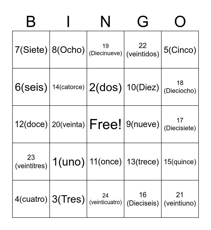 This bingo card has a free space and 24 words: 1(uno), 3(Tres), 2(dos), 4(cuatro), 5(Cinco), 7(Siete), 6(seis), 8(Ocho), 9(nueve), 11(once), 10(Diez), 12(doce), 13(trece), 15(quince), 14(catorce), 16 (Dieciseis), 17 (Diecisiete), 19 (Diecinueve), 18 (Dieciocho), 20(veinta), 21 (veintiuno), 23 (veintitres), 22 (veintidos) and 24 (veinticuatro).