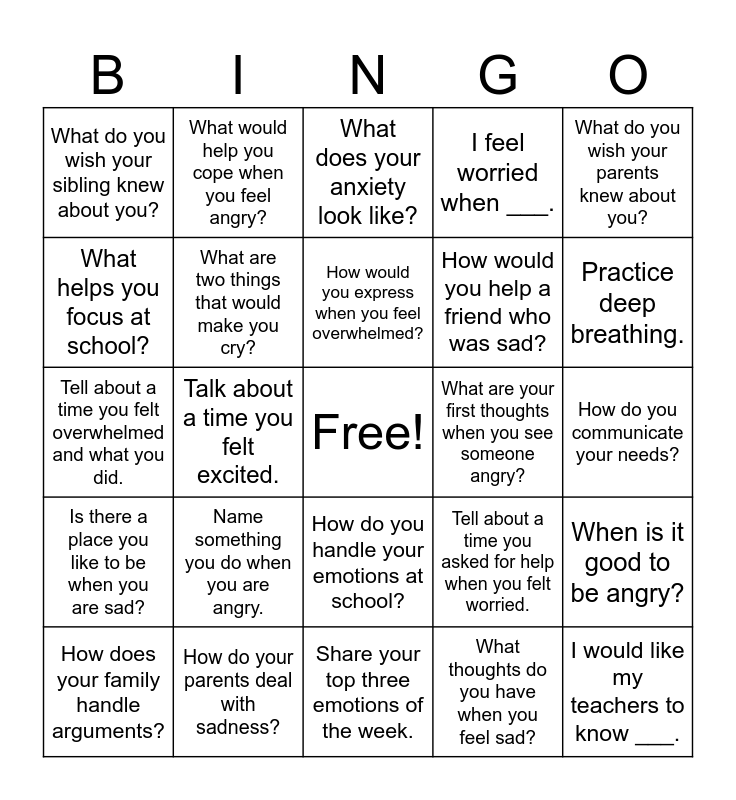 This bingo card has a free space and 24 words: Name something you do when you are angry., How do your parents deal with sadness?, How would you express when you feel overwhelmed?, How does your family handle arguments?, What do you wish your parents knew about you?, What do you wish your sibling knew about you?, What helps you focus at school?, What would help you cope when you feel angry?, What are your first thoughts when you see someone angry?, How do you handle your emotions at school?, How would you help a friend who was sad?, Tell about a time you felt overwhelmed and what you did., Tell about a time you asked for help when you felt worried., When is it good to be angry?, What are two things that would make you cry?, What thoughts do you have when you feel sad?, How do you communicate your needs?, What does your anxiety look like?, Practice deep breathing., Talk about a time you felt excited., I would like my teachers to know ___., Is there a place you like to be when you are sad?, I feel worried when ___. and Share your top three emotions of the week..