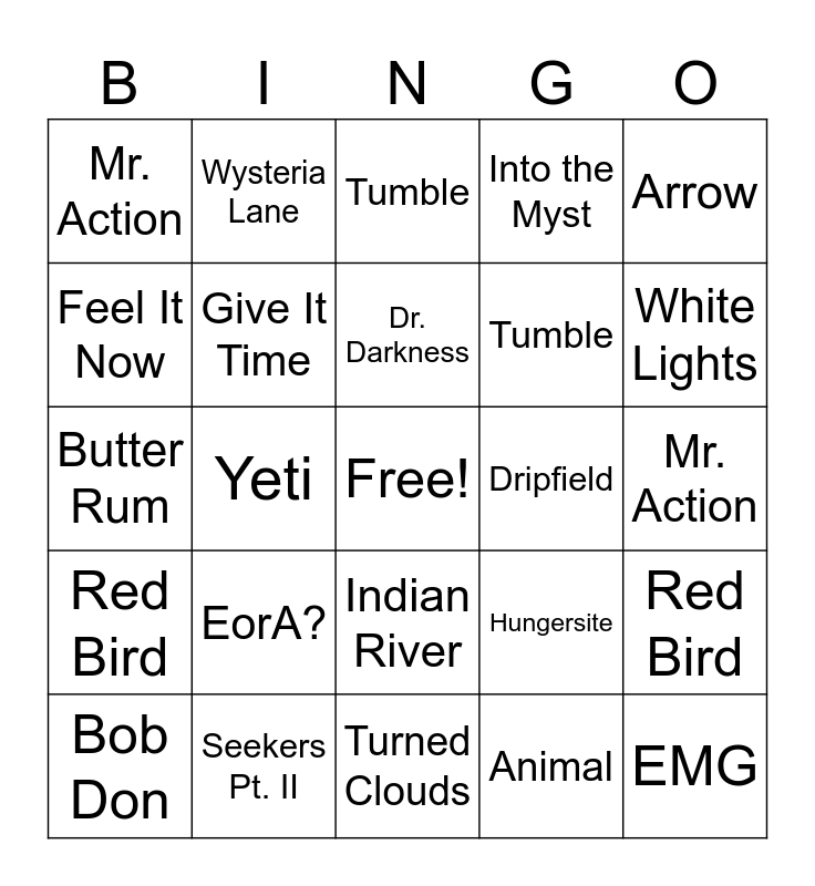 This bingo card has a free space and 106 words: Hot tea, Arcadia, Arrow, Hot love, Turbulence, Flodown, Madhuvan, Wysteria Lane, A Western Sun, Jive I, Jive II, Jive Lee, All I Need, So Ready, Slow Ready, Creatures, Tumble, Butter Rum, Yeti, Turned Clouds, Indian River, Time to Flee, Echo of a Rose, Drive, Empress, EorA?, White Lights, Into the Myst, Elizabeth, Rockdale, Hungersite, Animal, California Magic, Borne, Dripfield, Atlas Dogs, Silver Rising, Thatch, Dr. Darkness, Big Modern!, One In, One Out, Meter Maid, Media, Red Bird, Pancakes, Feel It Now, Lead Up, Mr. Action, Give It Time, EMG, Seekers Pt. I, Seekers Pt. II, Bob Don, Arcadia, Arrow, Hot love, Turbulence, Flodown, Madhuvan, Wysteria Lane, A Western Sun, Jive I, Jive II, Jive Lee, All I Need, So Ready, Slow Ready, Creatures, Tumble, Butter Rum, Yeti, Turned Clouds, Indian River, Time to Flee, Echo of a Rose, Drive, Empress, EorA?, White Lights, Into the Myst, Elizabeth, Rockdale, Hungersite, Animal, California Magic, Borne, Dripfield, Atlas Dogs, Silver Rising, Thatch, Dr. Darkness, Big Modern!, One In, One Out, Meter Maid, Media, Red Bird, Pancakes, Feel It Now, Lead Up, Mr. Action, Give It Time, EMG, Seekers Pt. I, Seekers Pt. II, Bob Don and HOT TEA.