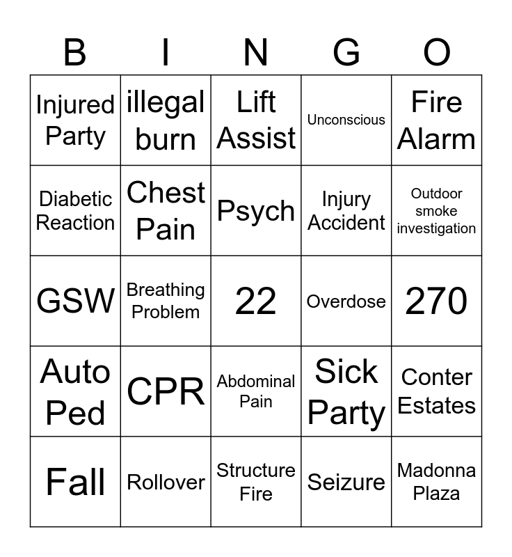 This bingo card has a free space and 24 words: CPR, Rollover, Psych, Fall, Fire Alarm, Injured Party, Diabetic Reaction, illegal burn, Overdose, Abdominal Pain, Injury Accident, GSW, Sick Party, Conter Estates, Chest Pain, Seizure, 270, Lift Assist, Outdoor smoke investigation, Breathing Problem, Madonna Plaza, Auto Ped, Unconscious and Structure Fire.