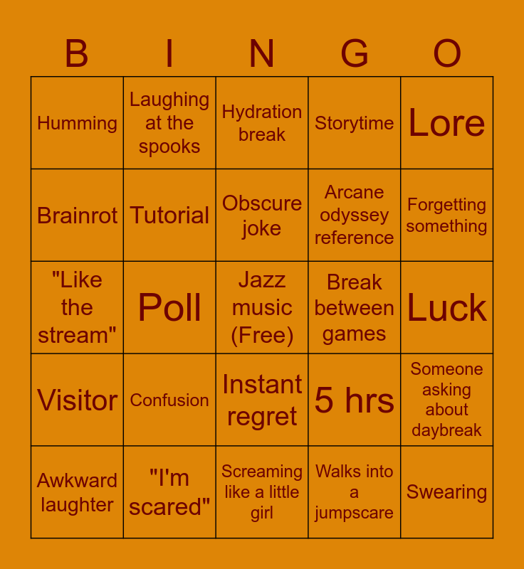 This bingo card has a free space and 24 words: Confusion, "I'm scared", Obscure joke, Awkward laughter, Lore, Humming, Brainrot, Laughing at the spooks, Break between games, Instant regret, Arcane odyssey reference, "Like the stream", 5 hrs, Someone asking about daybreak, Tutorial, Walks into a jumpscare, Luck, Hydration break, Forgetting something, Poll, Swearing, Visitor, Storytime and Screaming like a little girl.
