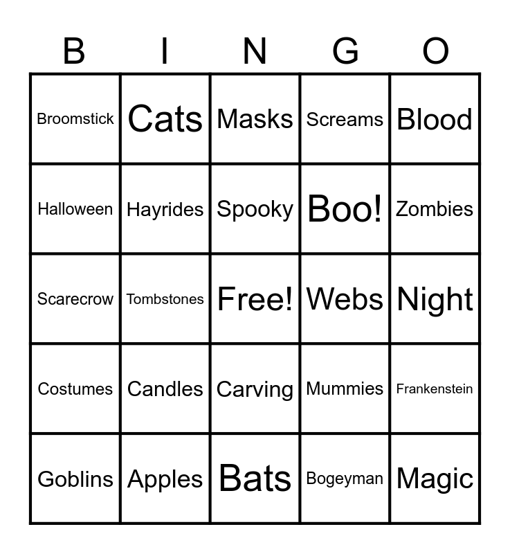 This bingo card has a free space and 40 words: Witches, Scarecrow, Haunted, Hayrides, Apples, Carving, Spooky, Autumn, Blood, Costumes, Tombstones, Screams, Magic, Night, Webs, Candles, Werewolf, Broomstick, Princess, Masks, Frankenstein, Bogeyman, Boo!, Halloween, October, TrickorTreat, Candy, Chocolate, Pumpkins, JackOLantern, Ghosts, Goblins, Monsters, Mummies, Zombies, Bats, Vampires, Spiders, Cats and Skeletons.
