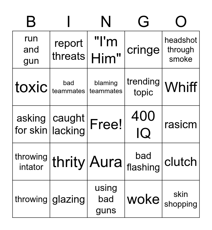 This bingo card has a free space and 24 words: thrity, glazing, blaming teammates, throwing, headshot through smoke, run and gun, toxic, report threats, 400 IQ, Aura, trending topic, asking for skin, bad flashing, clutch, bad teammates, woke, rasicm, "I'm Him", Whiff, caught lacking, skin shopping, throwing intator, cringe and using bad guns.