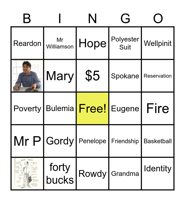 This bingo card has 2 images, a free space and 27 words: Junior, forty bucks, Hope, Poker player, Wellpinit, Reardon, Mary, $5, Eugene, Basketball, Bulemia, Grandma, Identity, Poverty, Identity, Rowdy, Friendship, Reservation, Mr P, Gordy, Roger, Spokane, Fire, Mr Williamson, Penelope, Polyester Suit and Drunk driver.