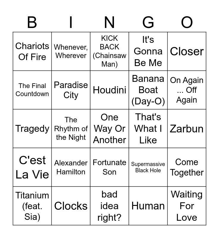 This bingo card has 115 words: It Was A Good Day, One More Night, Bad Habit, Leave The Door Open, Sheesh!, I Love It, It's Gonna Be Me, Just Dance, Bad Reputation, Adventure of a Lifetime, Apple, Electric Avenue, Disco, Girls & Boys, Rapp Snitch Knishes, Disco Inferno - Edit, Fortunate Son, Love Again, Kiss You, The Nights, Titanium (feat. Sia), KICK BACK (Chainsaw Man), Poker Face, Wonderwall, Funny Thing, C'est La Vie, Clocks, Look What You Made Me Do, Warriors, Life is a Highway, On Again ... Off Again, Houdini, The Rhythm of the Night, Anaconda, Love Me, Like a Prayer, Could You Be Loved, Cbat, Judas, Memories, Gimme! Gimme! Gimme!, Sandstorm, I Wonder, WAP, Chop Suey!, Sultans Of Swing, Human, The Final Countdown, She Looks So Perfect, ...Baby One More Time, Gangsta's Paradise, That's What I Like, Proud Mary, We Are One (Ole Ola, Smooth Operator, Jonas Brothers, Waiting For Love, I'm Good (Blue), The Bad Touch, Cruisin' for a Bruisin', Come Together, Freaking Out the Neighborhood, The Spins, Fat Bottomed, 33 Max Verstappen, Tank! (Cowboy Beebop), Can't Hold Us, Paradise City, Tragedy, Love Story, Zarbun, Please Please Please, I'm On My Way, Ride, Down Under, One Way Or Another, Alexander Hamilton, Chariots Of Fire, Fortunate Son, Mamma Mia, Material Girl, Whenever, Wherever, Don't You Worry Child, Supermassive Black Hole, Banana Boat (Day-O), She's Electric, My Type, You Shook Me All Night Long, Too Sweet, Murder On The Dancefloor, Last Friday Night (T.G.I.F.), Sweat (A La La La La Long), Young Dumb & Broke, Red Wine Supernova, Closer, Want to Want Me, Long Cool Woman (In a Black Dress), Walking On A Dream, Party Rock Anthem, Have You Ever Seen The Rain, Gentleman, Gloria, Baby, Hold the Line, Moves Like Jagger, I Want To Break Free, Heart Of Glass, Pump It, bad idea right?, Super Bass, Giulia, Dark Necessities, Hasta Manana, Femininomenon and I Gotta Feeling.