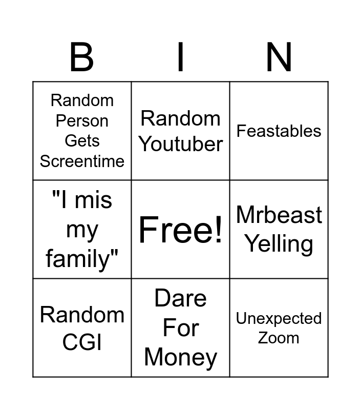 This bingo card has a free space and 8 words: Mrbeast Yelling, Feastables, Random Youtuber, Random CGI, Random Person Gets Screentime, Unexpected Zoom, "I mis my family" and Dare For Money.