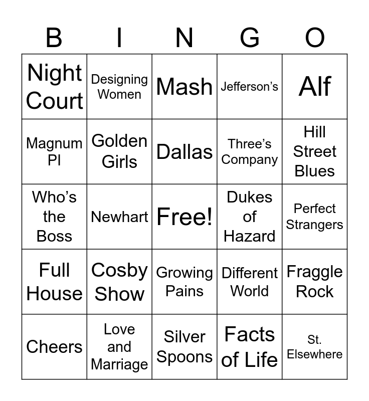 This bingo card has a free space and 34 words: Chips, Facts of Life, Knightrider, Family Ties, Full House, Golden Girls, Alf, Cheers, Designing Women, Wonder Year, Dallas, Mash, A Team, Cagney and Lacey, Dukes of Hazard, Hill Street Blues, Love and Marriage, Who’s the Boss, Cosby Show, Different World, Growing Pains, Head of the Class, Night Court, Perfect Strangers, Silver Spoons, St. Elsewhere, Jefferson’s, 227, Three’s Company, Magnum PI, Murder She Wrote, Newhart, Fraggle Rock and Who’s the Boss.