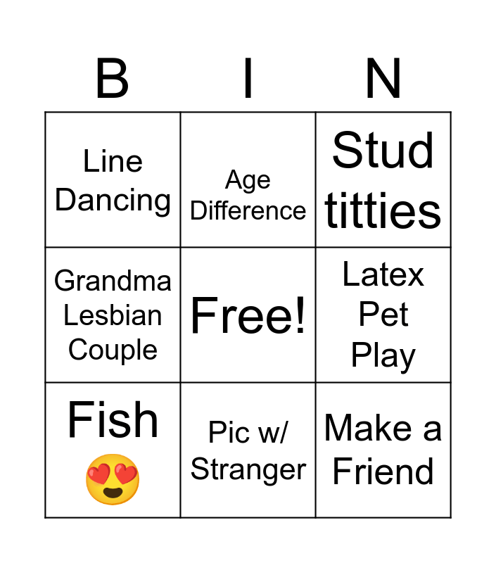 This bingo card has a free space and 8 words: Latex Pet Play, Stud titties, Age Difference, Fish 😍, Line Dancing, Make a Friend, Grandma Lesbian Couple and Pic w/ Stranger.
