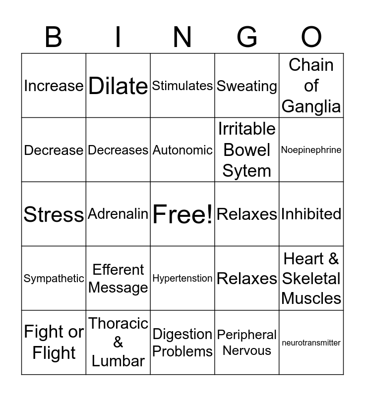 This bingo card has a free space and 24 words: Efferent Message, Thoracic & Lumbar, Autonomic, Fight or Flight, Chain of Ganglia, Increase, Decrease, Dilate, Relaxes, Hypertenstion, Irritable Bowel Sytem, Stress, Relaxes, Heart & Skeletal Muscles, Decreases, Peripheral Nervous, Inhibited, Stimulates, Noepinephrine, Adrenalin, neurotransmitter, Sympathetic, Sweating and Digestion Problems.