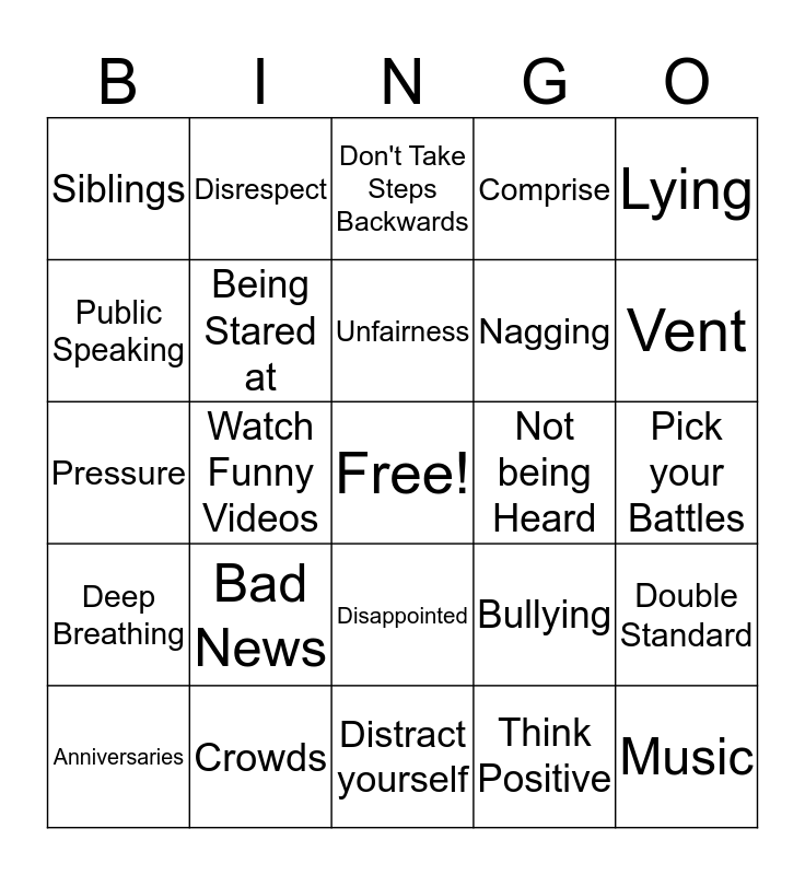 This bingo card has a free space and 24 words: Bad News, Crowds, Unfairness, Anniversaries, Lying, Siblings, Public Speaking, Disrespect, Not being Heard, Disappointed, Nagging, Pressure, Bullying, Double Standard, Being Stared at, Think Positive, Pick your Battles, Don't Take Steps Backwards, Vent, Watch Funny Videos, Music, Deep Breathing, Comprise and Distract yourself.