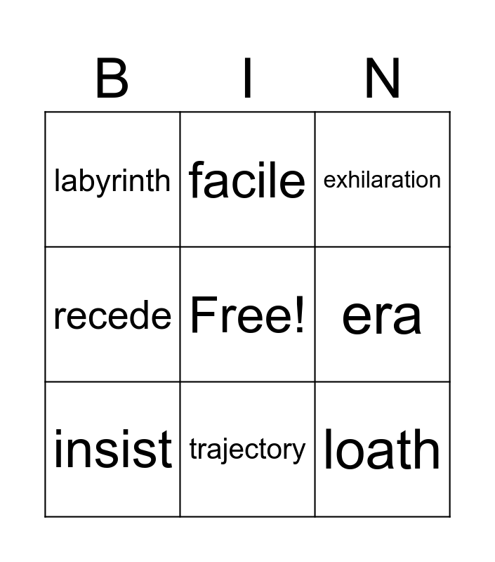 This bingo card has a free space and 8 words: era, exhilaration, facile, insist, labyrinth, loath, recede and trajectory.