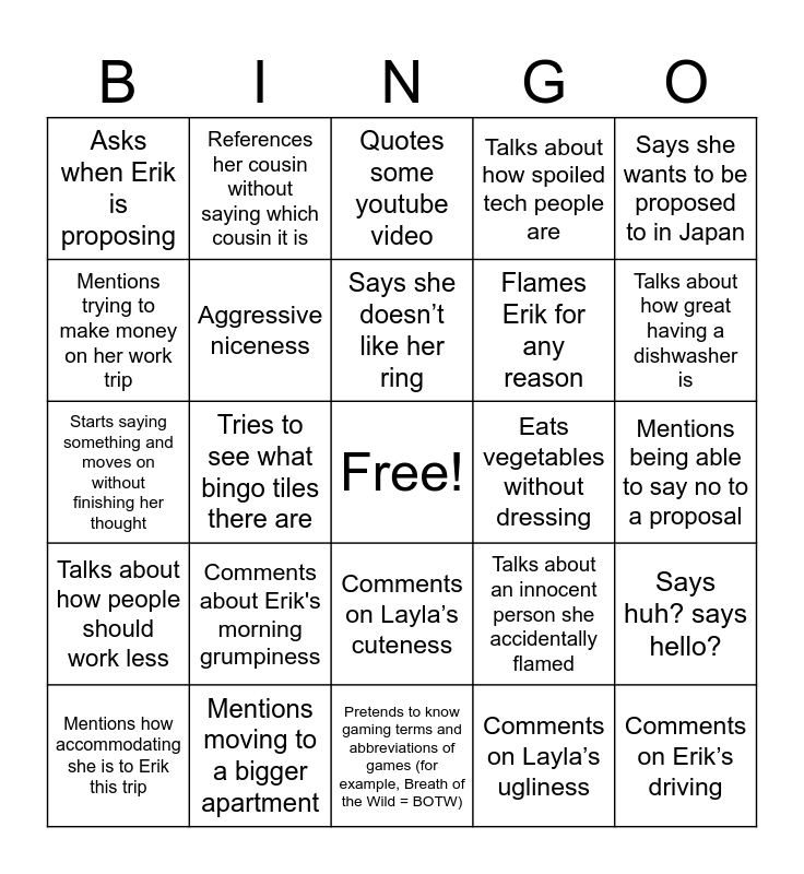 This bingo card has a free space and 26 words: Comments on Layla’s cuteness, Comments on Layla’s ugliness, Says she doesn’t like her ring, Mentions moving to a bigger apartment, Says she wants to be proposed to in Japan, Asks when Erik is proposing, Mentions trying to make money on her work trip, References her cousin without saying which cousin it is, Mentions being able to say no to a proposal, Talks about an innocent person she accidentally flamed, Flames Erik for any reason, Starts saying something and moves on without finishing her thought, Says huh? says hello?, Mentions how accommodating she is to Erik this trip, Tries to see what bingo tiles there are, Asks who made the bingo tiles, Talks about how spoiled tech people are, Talks about how people should work less, Quotes some youtube video, Comments on Erik’s driving, Talks about how great having a dishwasher is, Pretends to know gaming terms and abbreviations of games (for example, Breath of the Wild = BOTW), Eats vegetables without dressing, Comments about Erik's morning grumpiness, Aggressive niceness and Complains about Erik stealing all her friends.
