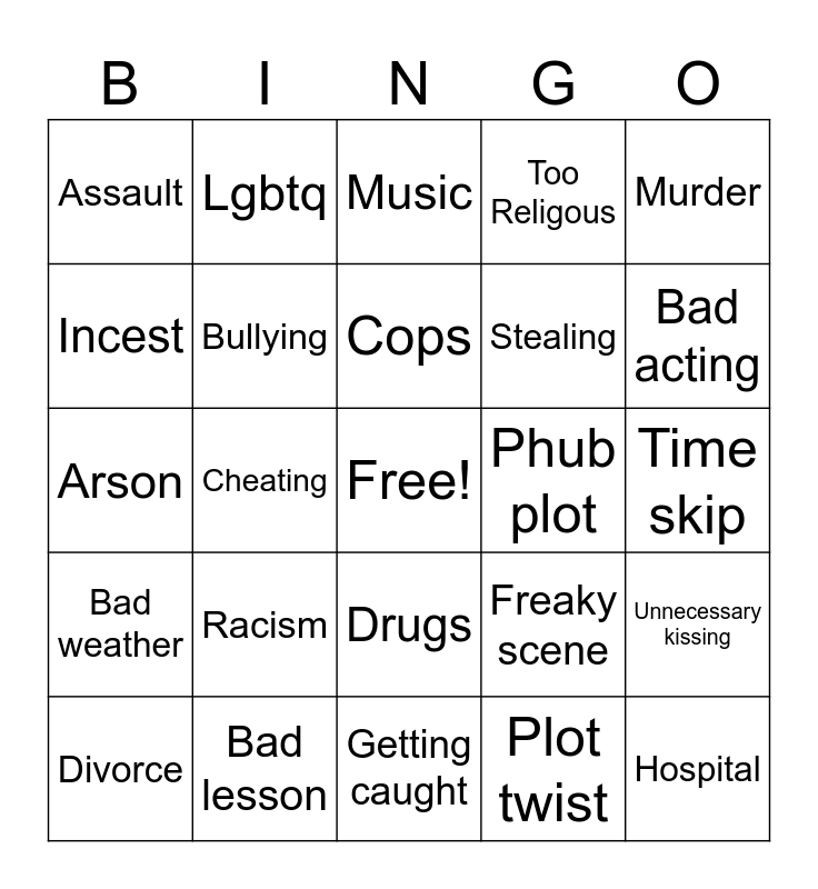 This bingo card has a free space and 24 words: Racism, Bad lesson, Cops, Divorce, Murder, Assault, Incest, Lgbtq, Phub plot, Drugs, Stealing, Arson, Freaky scene, Unnecessary kissing, Bullying, Plot twist, Time skip, Music, Bad acting, Cheating, Hospital, Bad weather, Too Religous and Getting caught.