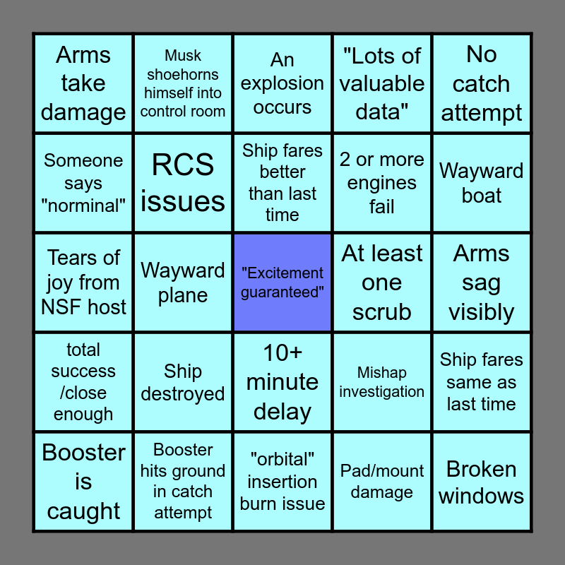 This bingo card has a free space and 24 words: Ship destroyed, Booster hits ground in catch attempt, Ship fares better than last time, Booster is caught, No catch attempt, Arms take damage, Someone says "norminal", Musk shoehorns himself into control room, At least one scrub, 10+ minute delay, 2 or more engines fail, Tears of joy from NSF host, Mishap investigation, Ship fares same as last time, RCS issues, Pad/mount damage, Arms sag visibly, An explosion occurs, Wayward boat, Wayward plane, Broken windows, total success /close enough, "Lots of valuable data" and "orbital" insertion burn issue.