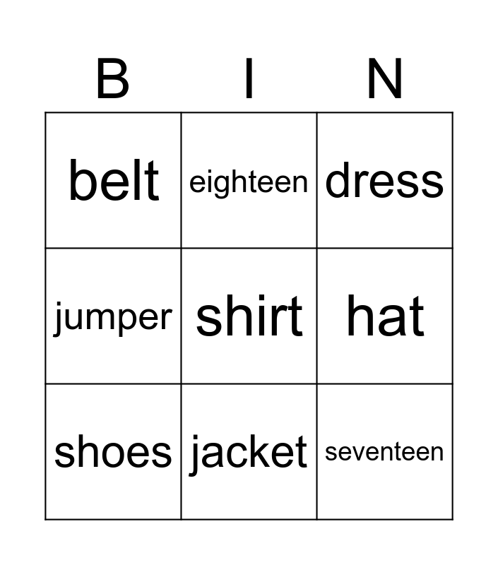 This bingo card has a free space and 8 words: jumper, eighteen, hat, shoes, dress, belt, jacket and seventeen.