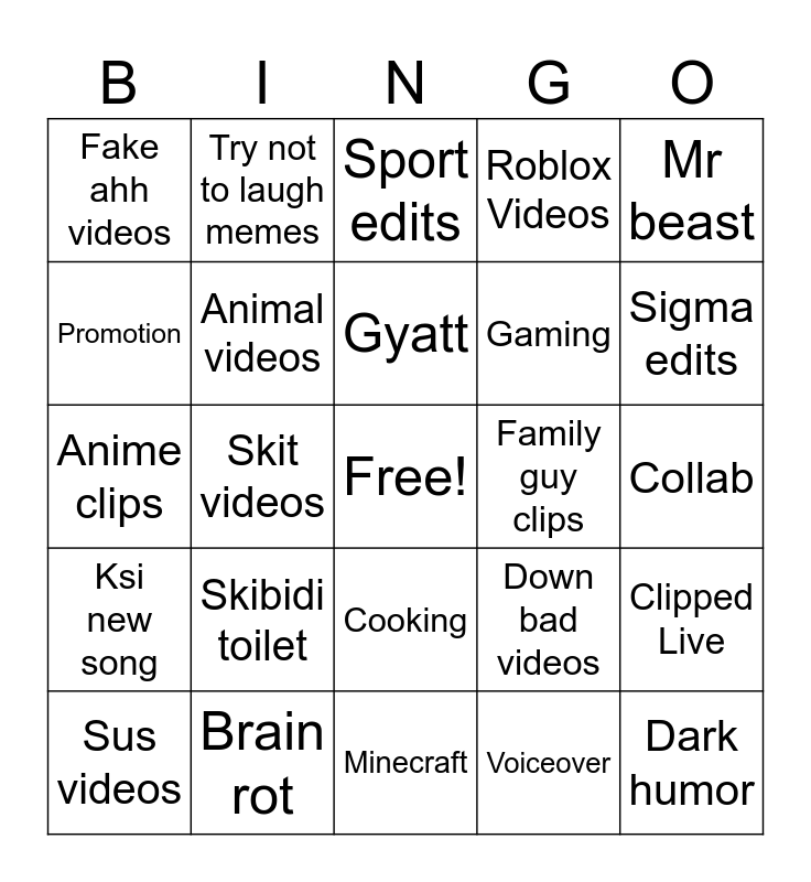 This bingo card has a free space and 24 words: Skibidi toilet, Brain rot, Gyatt, Sus videos, Mr beast, Fake ahh videos, Promotion, Try not to laugh memes, Family guy clips, Cooking, Gaming, Anime clips, Down bad videos, Clipped Live, Animal videos, Voiceover, Collab, Sport edits, Sigma edits, Skit videos, Dark humor, Ksi new song, Roblox Videos and Minecraft.