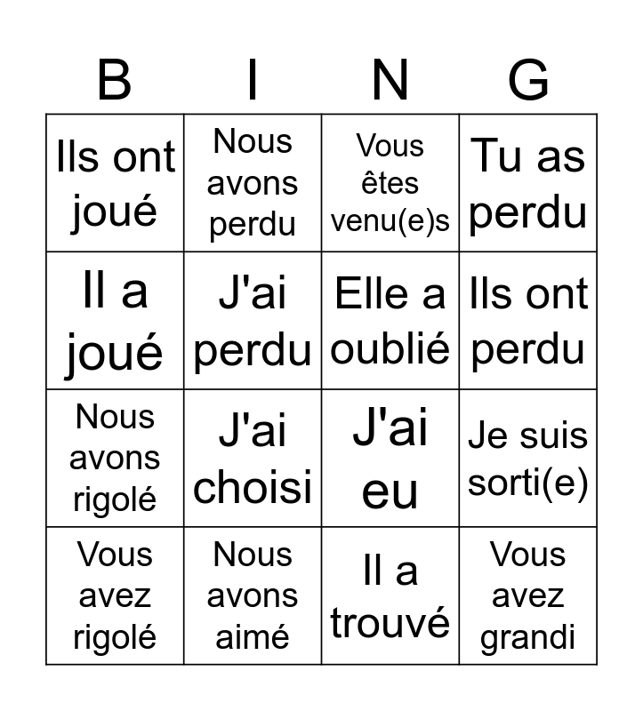 This bingo card has 29 words: J'ai bu, Tu as grandi, Je suis sorti(e), Nous avons été, Ils ont joué, Vous êtes venu(e)s, Elle a oublié, Tu es parti(e), Nous avons aimé, Ils ont ouvert, Il a trouvé, Vous avez rigolé, Elles sont tombées, Nous sommes resté(e)s, J'ai choisi, Elle a eu, Nous avons bu, Vous avez grandi, Il a joué, J'ai eu, Elle est tombée, Tu as ouvert, Nous avons rigolé, J'ai perdu, Tu as perdu, Nous avons perdu, Vous avez perdu, Ils ont perdu and Tu as bu.