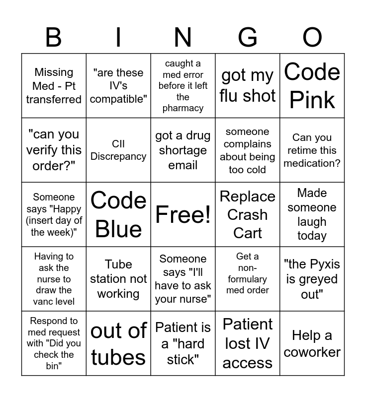 This bingo card has a free space and 29 words: Respond to med request with "Did you check the bin", Important Communication text from Tonya, Code Blue, Code Orange, Missing Med - Pt transferred, caught a med error before it left the pharmacy, CII Discrepancy, Tube station not working, Replace Crash Cart, out of tubes, Made someone laugh today, Help a coworker, Patient is a "hard stick", Patient lost IV access, Can you retime this medication?, Family you asks you for food/drink item from the nutrition room, Someone says "I'll have to ask your nurse", Having to ask the nurse to draw the vanc level, Code Pink, Someone says "Happy (insert day of the week)", Get a non-formulary med order, someone complains about being too hot, someone complains about being too cold, "can you verify this order?", got my flu shot, "are these IV's compatible", "the Pyxis is greyed out", got a drug shortage email and smile while walking down the hallway and someone smiles back.