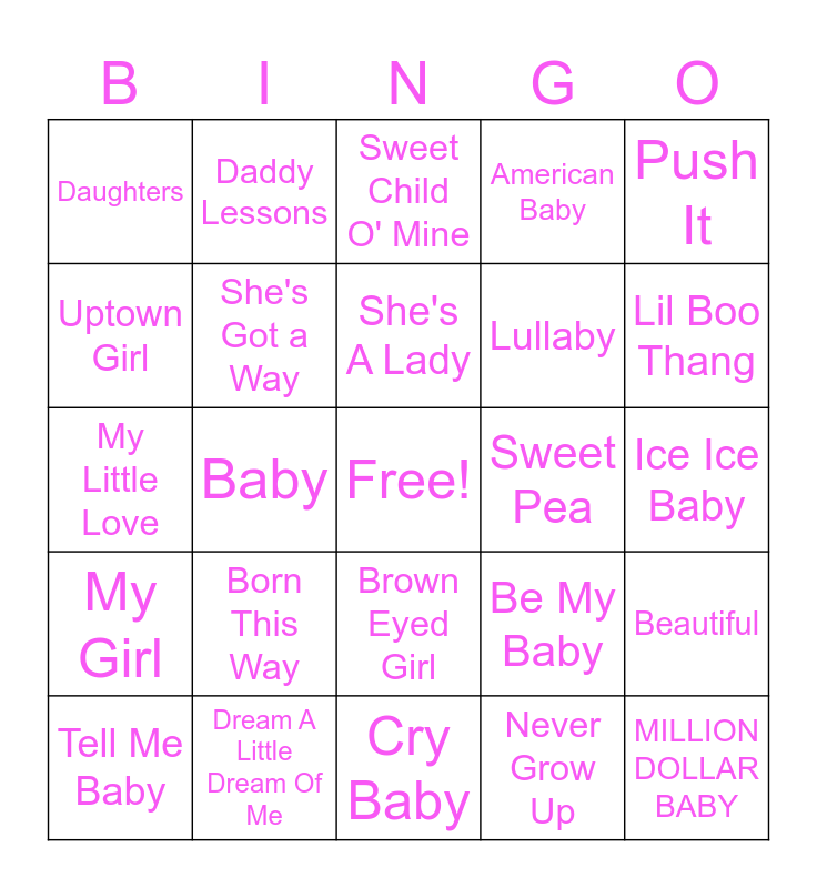 This bingo card has a free space and 31 words: Cry Baby, Baby Love, Baby, Always Be My Baby, Daughters, Sweet Child O' Mine, She's Got a Way, Be My Baby, Sweet Pea, Never Grow Up, Ice Ice Baby, MILLION DOLLAR BABY, Run the World (Girls), ...Baby One More Time, Lil Boo Thang, Hey Baby, Beautiful, Born This Way, My Girl, Brown Eyed Girl, Push It, Fat Bottomed Girls, Tell Me Baby, Daddy Lessons, Lullaby, Uptown Girl, American Baby, My Little Love, Dream A Little Dream Of Me, She's A Lady and Isn't She Lovely.