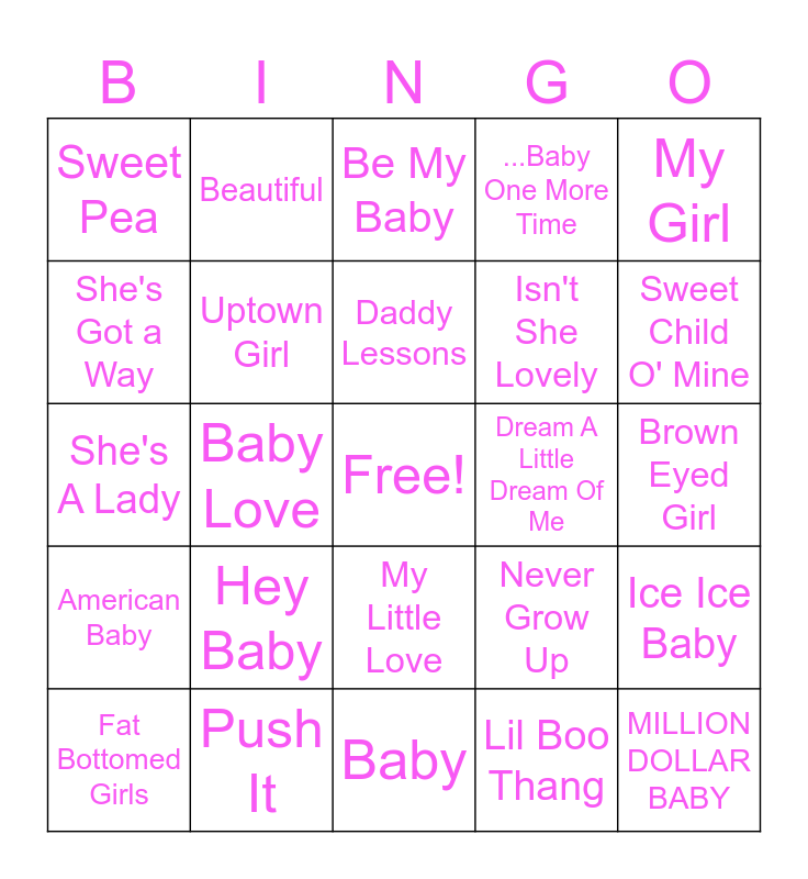 This bingo card has a free space and 31 words: Baby, Born This Way, Baby Love, Tell Me Baby, Sweet Pea, Be My Baby, Uptown Girl, Never Grow Up, Dream A Little Dream Of Me, Lil Boo Thang, Brown Eyed Girl, MILLION DOLLAR BABY, Daughters, Run the World (Girls), Sweet Child O' Mine, Always Be My Baby, Ice Ice Baby, Hey Baby, American Baby, My Little Love, My Girl, Cry Baby, Fat Bottomed Girls, Beautiful, Isn't She Lovely, She's Got a Way, ...Baby One More Time, She's A Lady, Push It, Daddy Lessons and Lullaby.