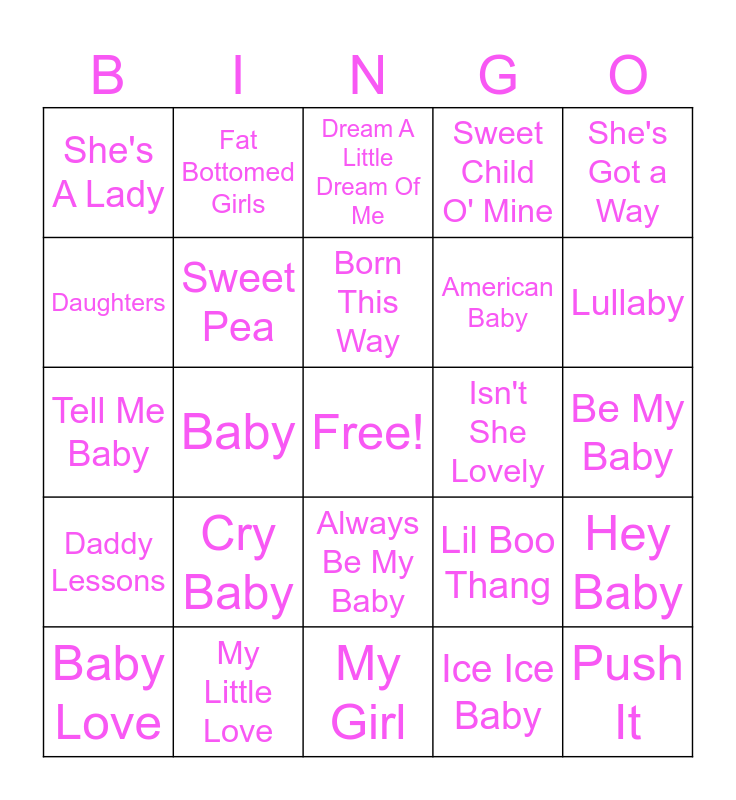 This bingo card has a free space and 31 words: My Girl, Uptown Girl, Baby, Brown Eyed Girl, She's A Lady, Dream A Little Dream Of Me, Sweet Pea, Lil Boo Thang, Isn't She Lovely, Ice Ice Baby, Be My Baby, Push It, Beautiful, Never Grow Up, Lullaby, MILLION DOLLAR BABY, Hey Baby, Cry Baby, Daddy Lessons, Always Be My Baby, She's Got a Way, ...Baby One More Time, Baby Love, Fat Bottomed Girls, American Baby, Daughters, Sweet Child O' Mine, Tell Me Baby, My Little Love, Born This Way and Run the World (Girls).