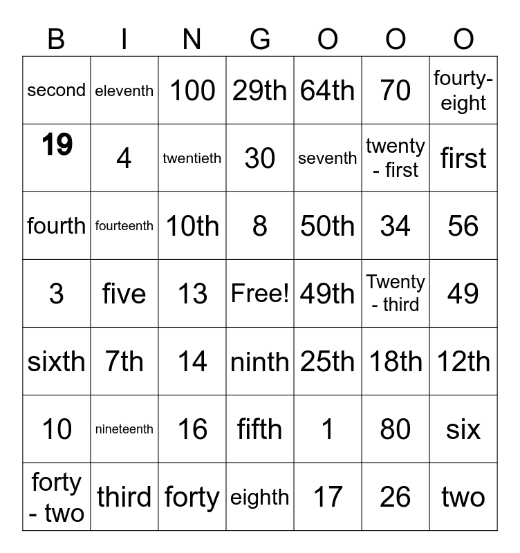 This bingo card has a free space and 48 words: 1, twenty - first, eighth, five, 10th, 49, eleventh, third, 70, ninth, fourty- eight, 29th, 34, 50th, 10, Twenty - third, 19, first, 80, 64th, seventh, 13, second, 4, six, twentieth, 56, forty - two, 8, fourteenth, 26, 49th, 12th, nineteenth, 3, 25th, 18th, fourth, 14, 16, sixth, two, 100, forty, 30, fifth, 7th and 17.