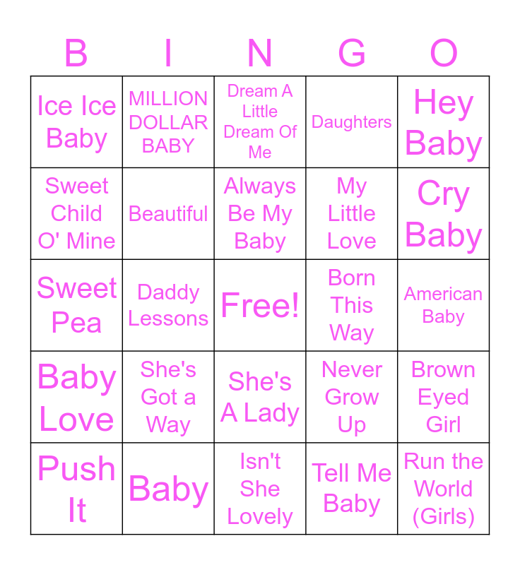 This bingo card has a free space and 31 words: Isn't She Lovely, Fat Bottomed Girls, Daddy Lessons, Be My Baby, Ice Ice Baby, Dream A Little Dream Of Me, Beautiful, Never Grow Up, Born This Way, Tell Me Baby, American Baby, Run the World (Girls), My Girl, Lullaby, Cry Baby, Lil Boo Thang, Brown Eyed Girl, She's Got a Way, Baby Love, She's A Lady, Hey Baby, Uptown Girl, Push It, MILLION DOLLAR BABY, My Little Love, Sweet Child O' Mine, Daughters, Sweet Pea, Baby, Always Be My Baby and ...Baby One More Time.