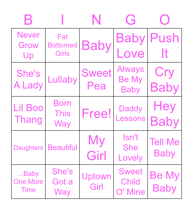 This bingo card has a free space and 31 words: Uptown Girl, My Little Love, Born This Way, MILLION DOLLAR BABY, Never Grow Up, Baby, Lullaby, Isn't She Lovely, Daddy Lessons, Sweet Child O' Mine, Hey Baby, Be My Baby, American Baby, Ice Ice Baby, Cry Baby, Run the World (Girls), Tell Me Baby, Beautiful, Daughters, My Girl, Push It, Brown Eyed Girl, ...Baby One More Time, Fat Bottomed Girls, Always Be My Baby, She's A Lady, Baby Love, Lil Boo Thang, She's Got a Way, Sweet Pea and Dream A Little Dream Of Me.