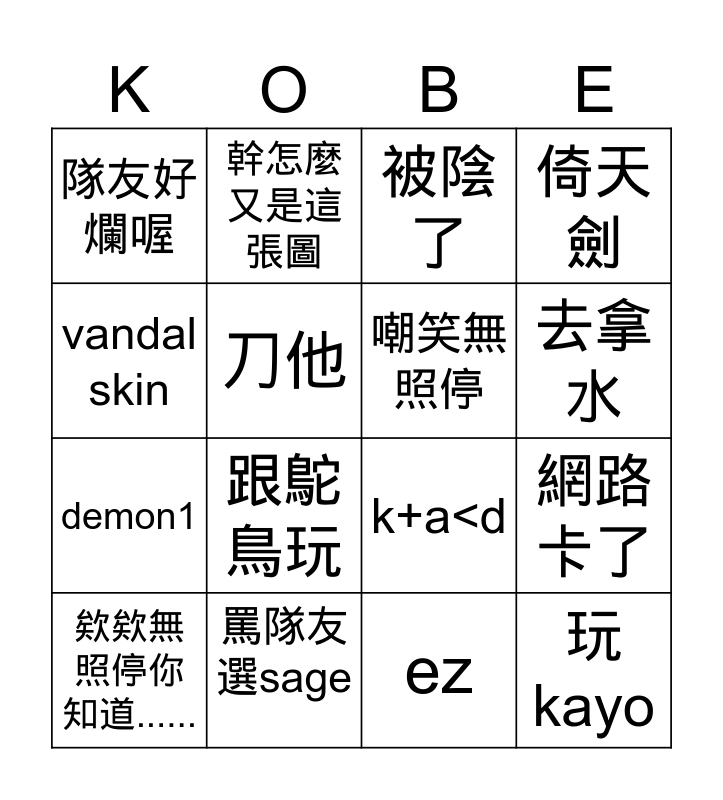 This bingo card has 16 words: 罵隊友選sage, 網路卡了, 被陰了, 隊友好爛喔, demon1, 幹怎麼又是這張圖, k+a<d, ez, vandal skin, 刀他, 欸欸無照停你知道......, 倚天劍, 跟鴕鳥玩, 去拿水, 嘲笑無照停 and 玩kayo.
