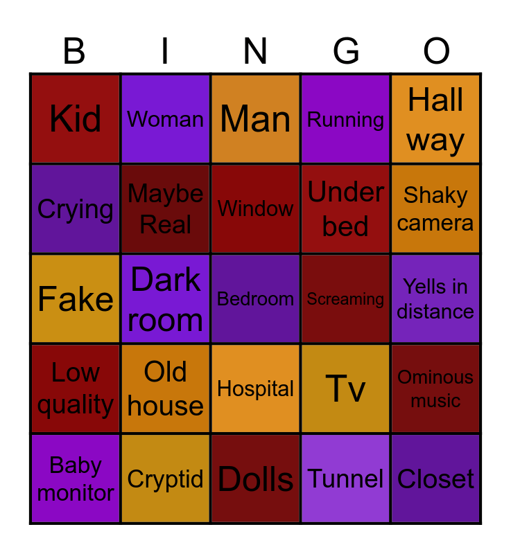 This bingo card has a free space and 24 words: Baby monitor, Old house, Window, Tunnel, Hall way, Kid, Woman, Man, Screaming, Yells in distance, Fake, Maybe Real, Tv, Ominous music, Crying, Cryptid, Dolls, Running, Shaky camera, Low quality, Dark room, Hospital, Under bed and Closet.