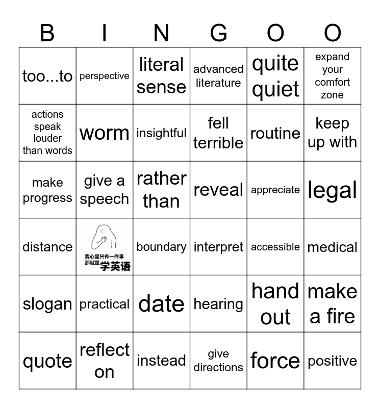 This bingo card has 1 images and 35 words: hearing, date, give directions, actions speak louder than words, distance, reveal, worm, instead, quite quiet, hand out, keep up with, advanced literature, make a fire, give a speech, fell terrible, too...to, slogan, appreciate, make progress, literal sense, rather than, interpret, boundary, accessible, perspective, routine, reflect on, insightful, expand your comfort zone, positive, quote, medical, legal, practical and force.