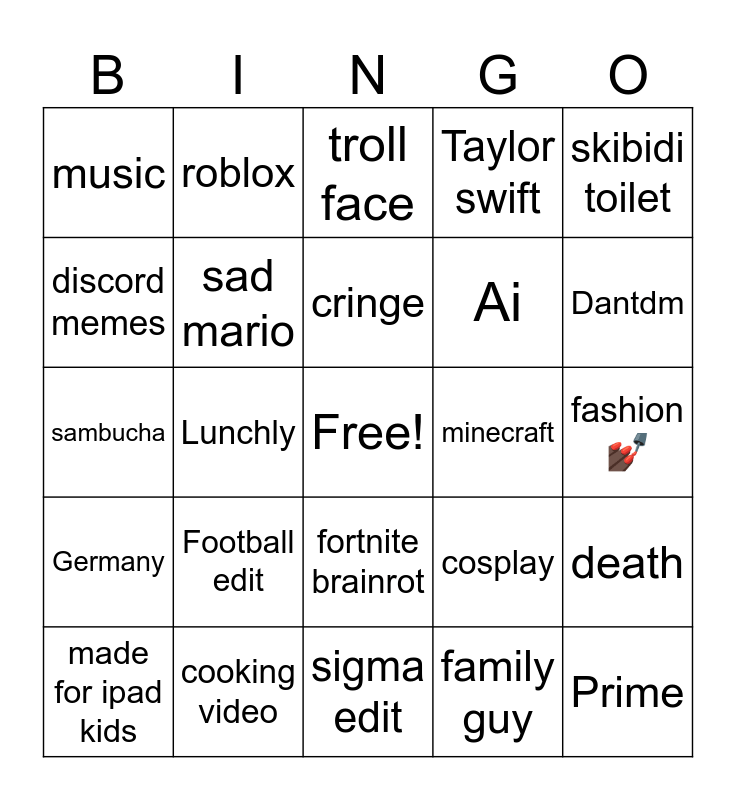 This bingo card has a free space and 24 words: Football edit, cooking video, cringe, made for ipad kids, skibidi toilet, music, discord memes, roblox, minecraft, fortnite brainrot, Ai, sambucha, cosplay, death, sad mario, family guy, fashion💅🏿, troll face, Dantdm, Lunchly, Prime, Germany, Taylor swift and sigma edit.