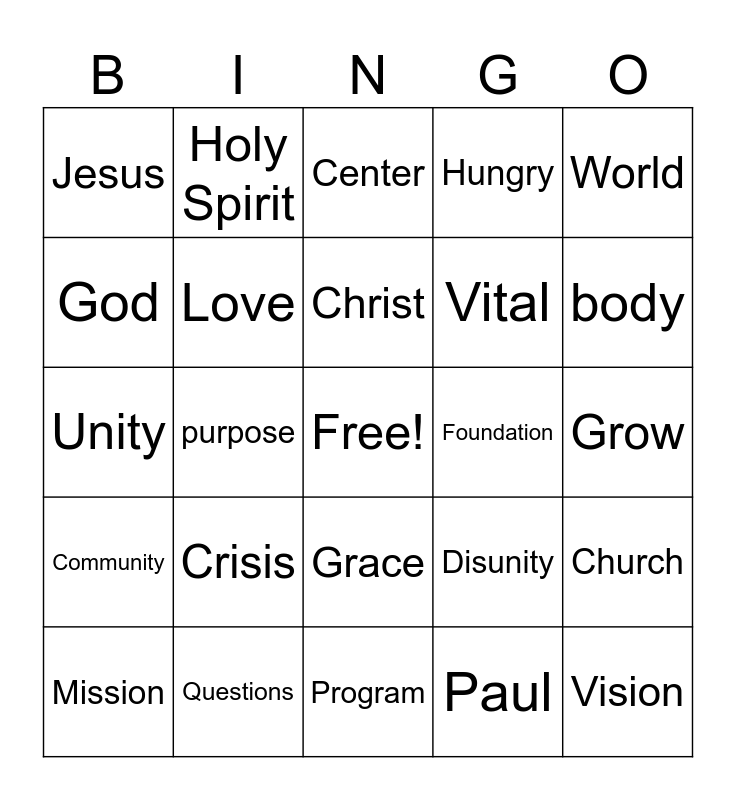 This bingo card has a free space and 24 words: Crisis, Questions, Christ, Mission, World, Jesus, God, Holy Spirit, Foundation, Grace, Vital, Unity, Disunity, Church, Love, Paul, Grow, Center, body, purpose, Vision, Community, Hungry and Program.